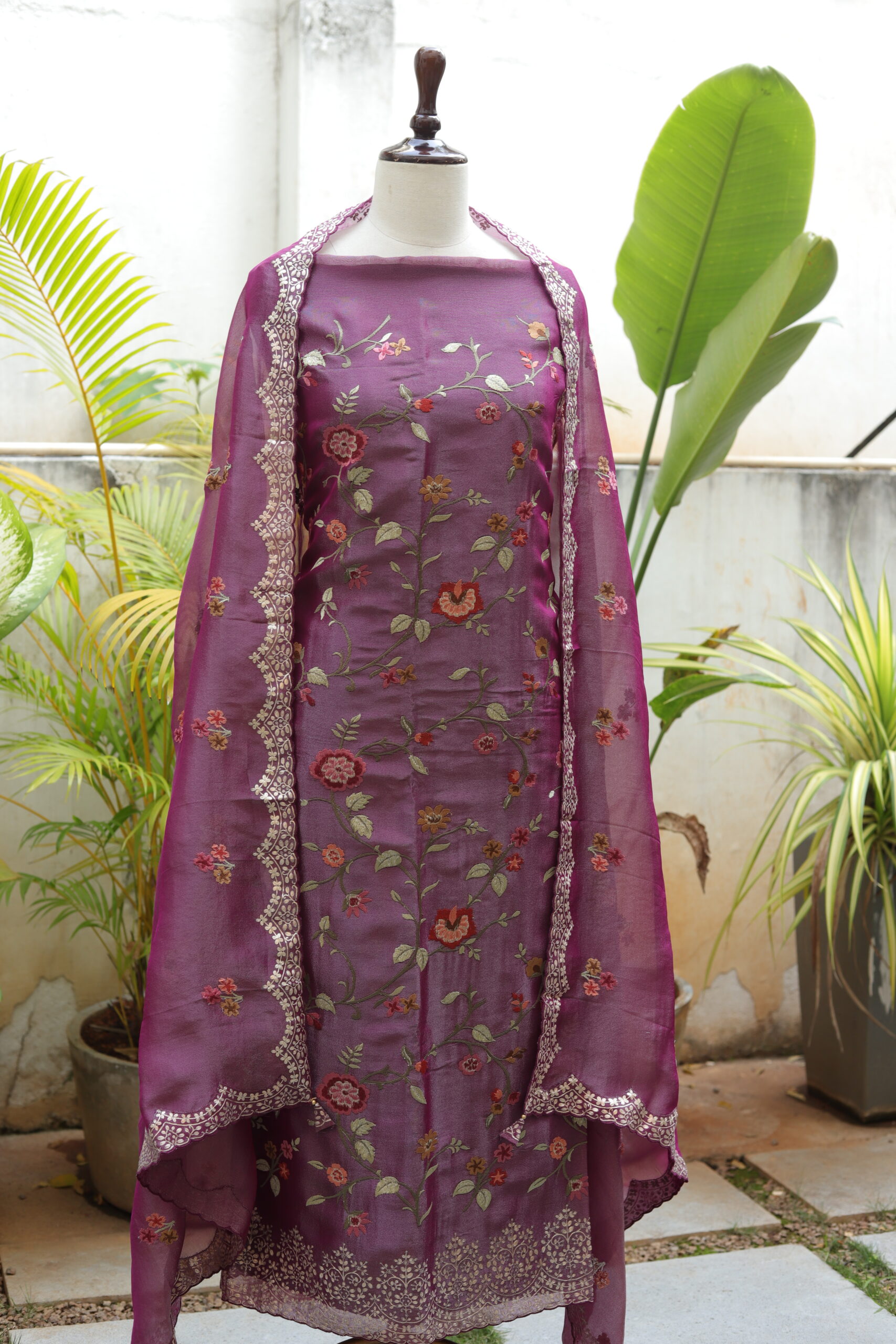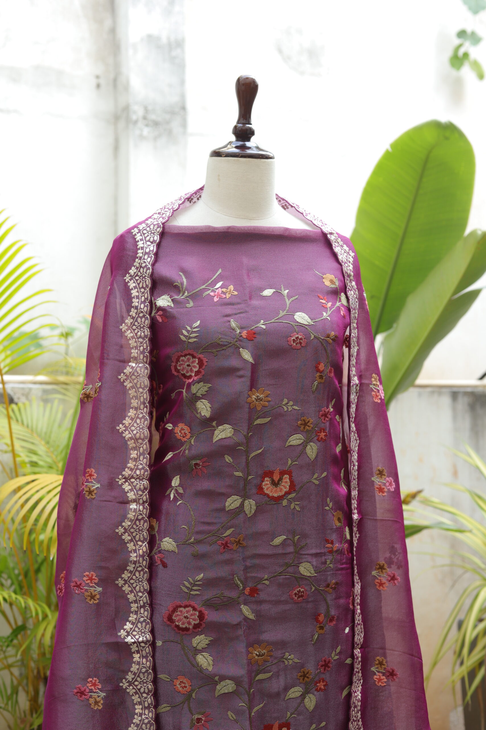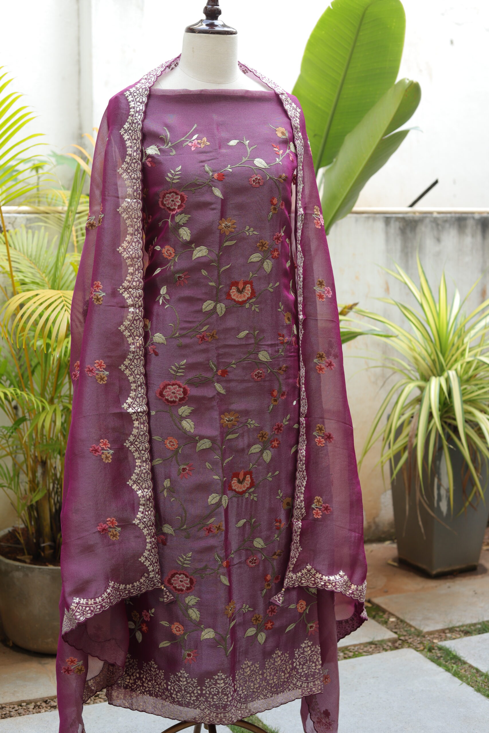 Elegant unstitched  salwar suit crafted in premium tissue fabric, beautifully adorned with delicate all-over thread embroidery featuring graceful floral motifs. The edges are finely highlighted with subtle zari work, adding a touch of shimmer and refined detailing. Paired with a lightweight tissue dupatta finished with intricate zari borders, this ensemble exudes timeless elegance—perfect for festive gatherings, daytime celebrations, and intimate functions.