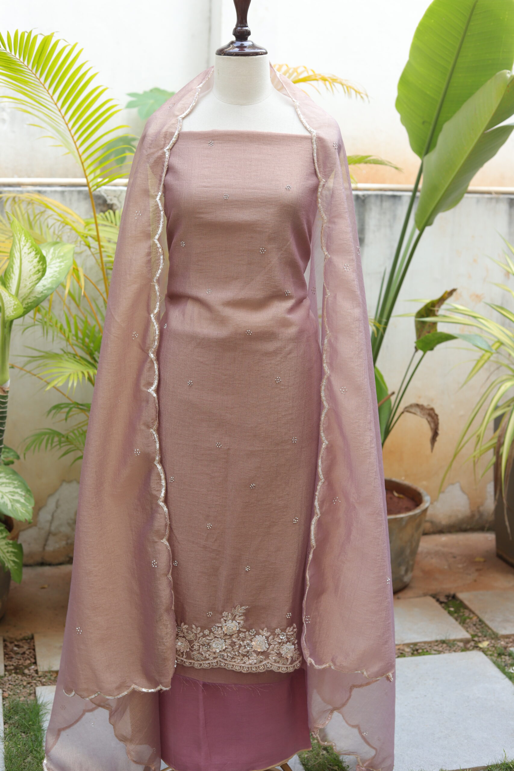 This elegant unstitched dress material is crafted in luxurious tissue fabric, beautifully adorned with delicate moti (pearl) handwork scattered all over the top, adding a subtle shimmer and refined charm. It is paired with a sheer tissue dupatta featuring intricate pearl detailing and finely finished scalloped edges, enhancing the overall sophistication. Perfect for festive occasions, intimate celebrations, and elegant evenings, this ensemble reflects timeless beauty with a soft, graceful appeal.