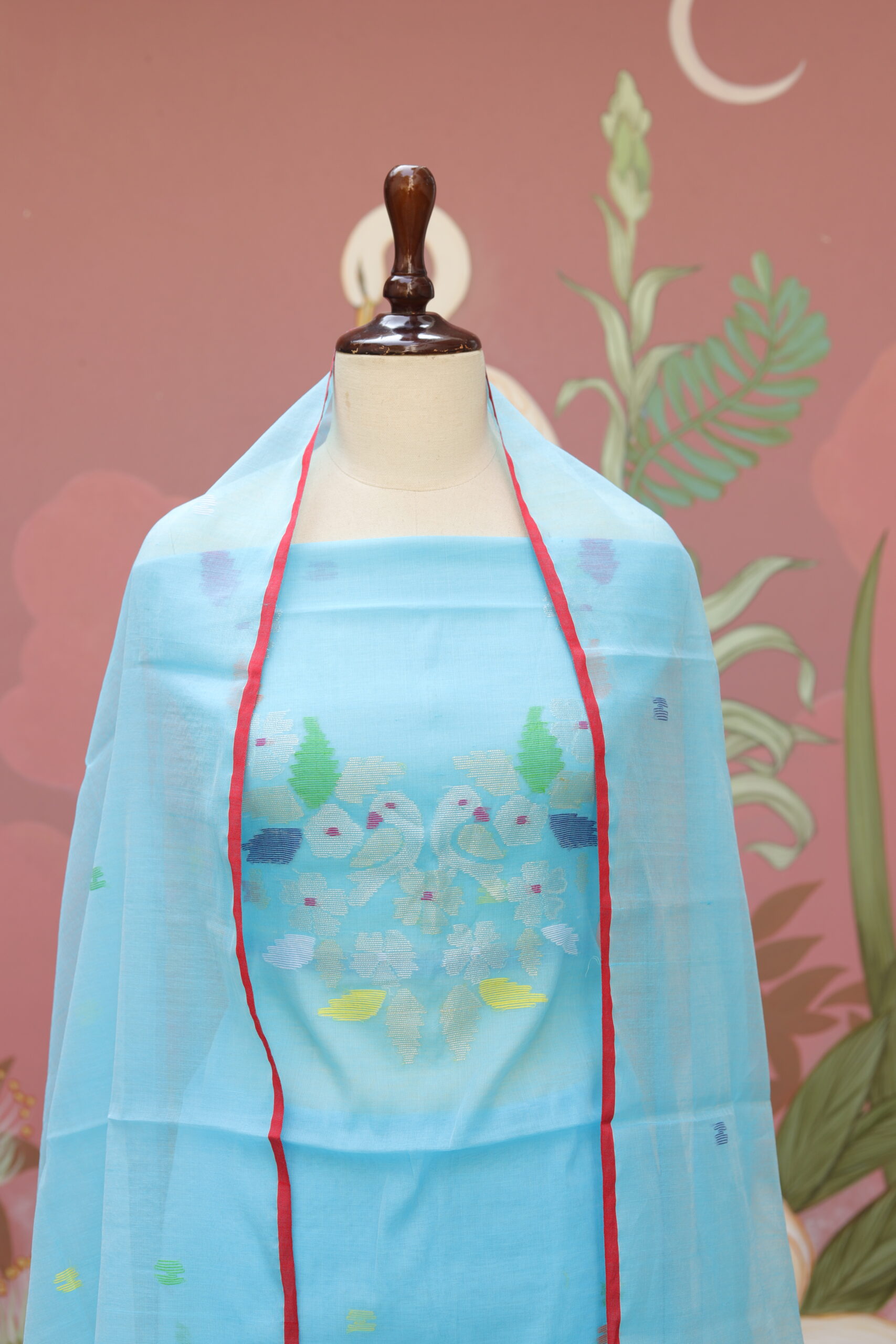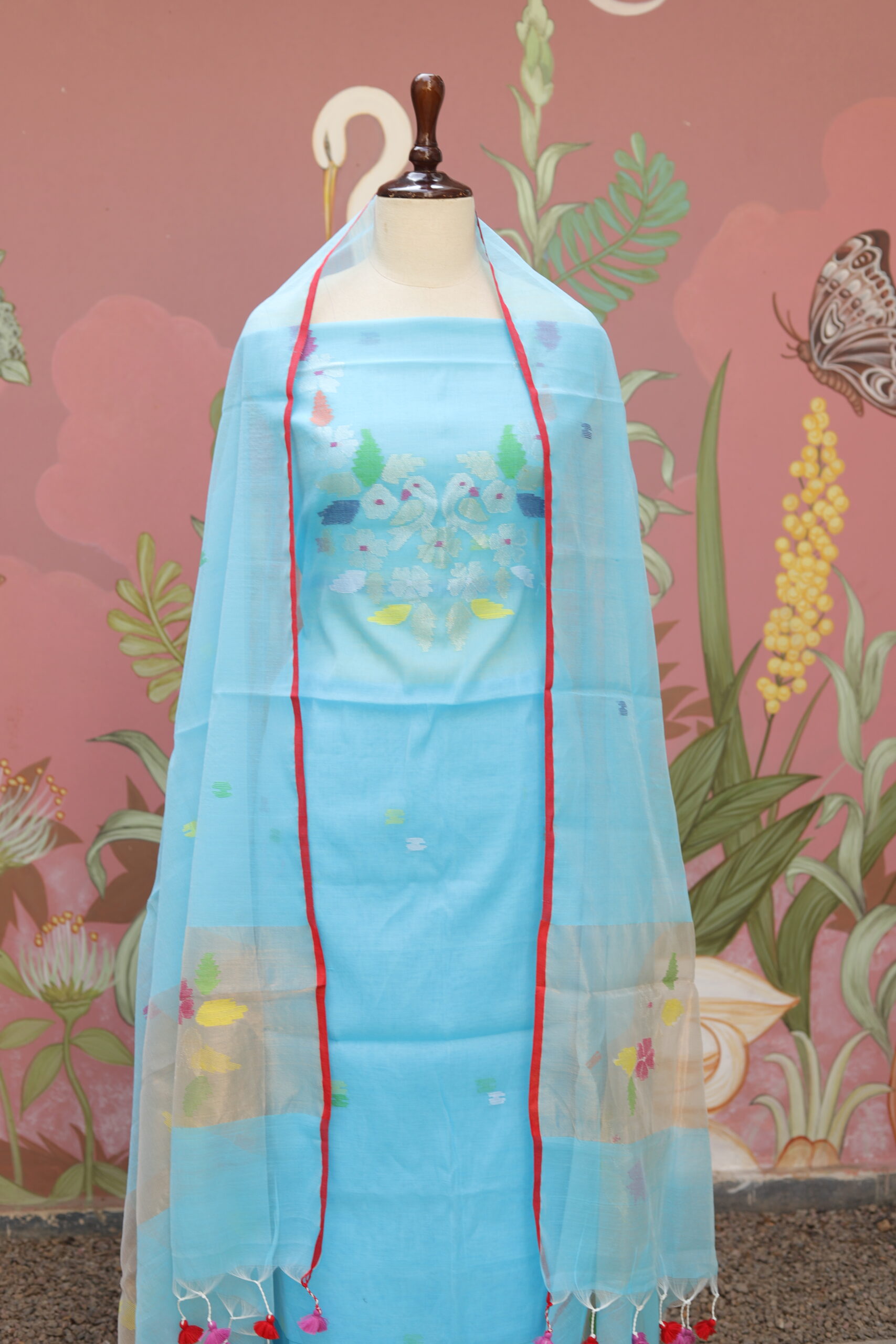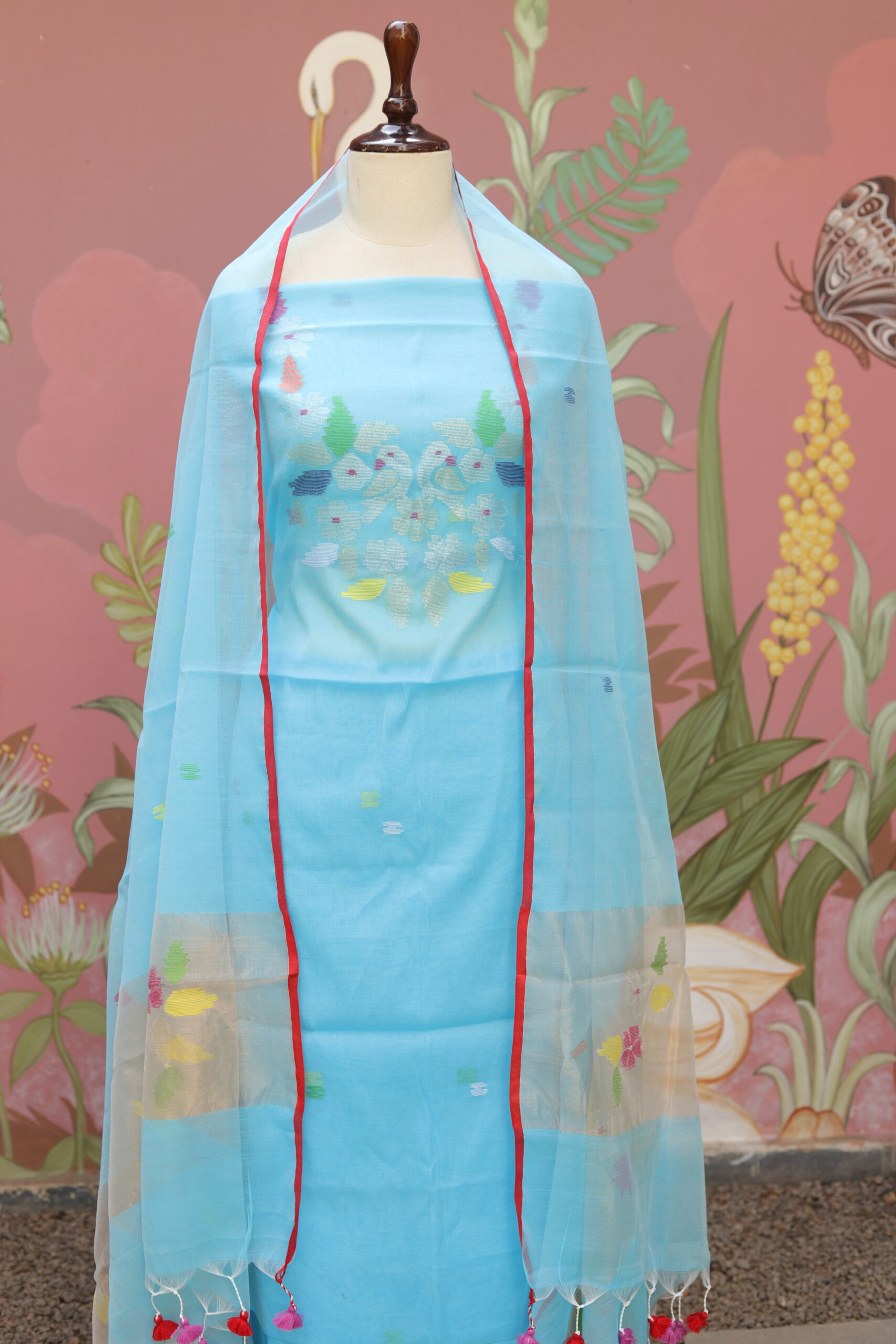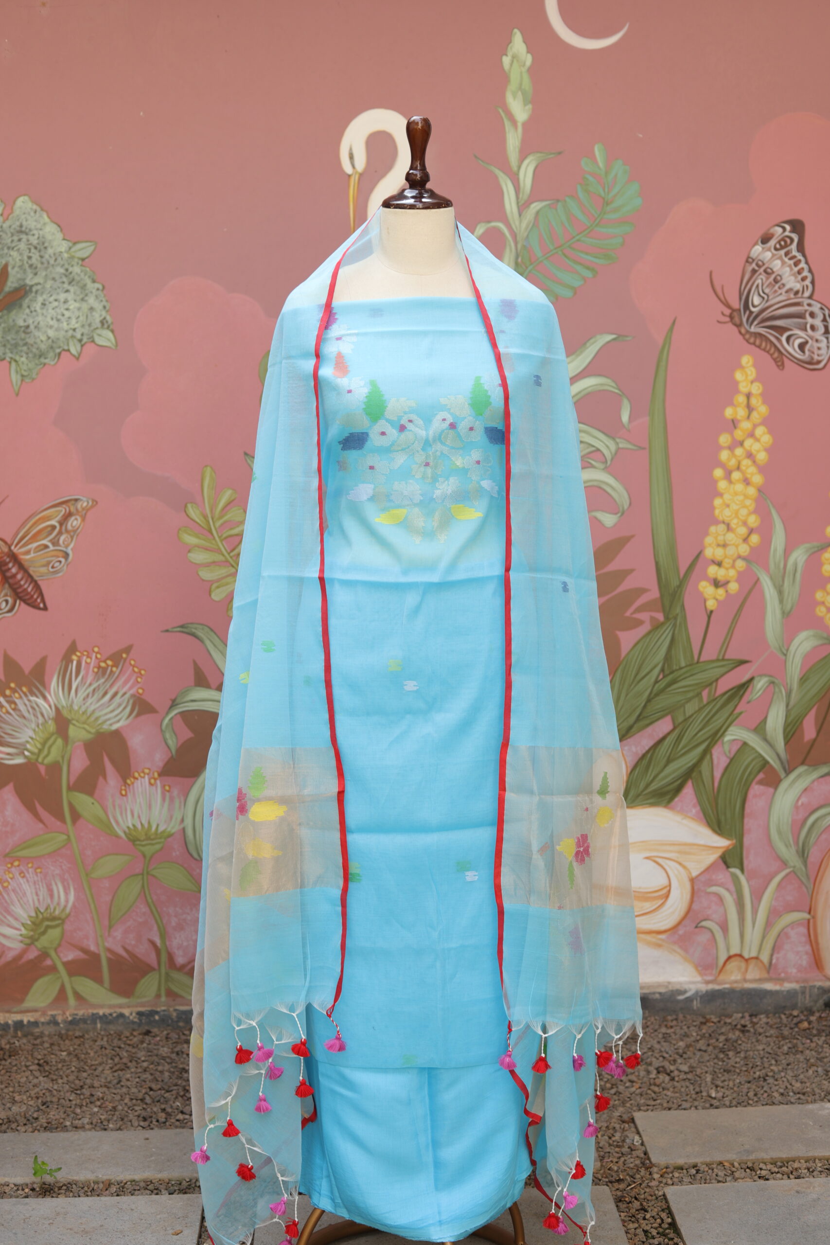 Gracefully crafted in pure muslin fabric, this elegant ensemble showcases delicate Jamdani detailing highlighted on the neckline and along the edges of the dupatta. The soft, breathable texture of muslin lends effortless comfort, while the subtle woven motifs add a touch of heritage charm. Finished with a beautifully coordinated dupatta enhanced with fine borders and tassel accents, this outfit is perfect for day festivities, cultural gatherings, and refined ethnic styling.