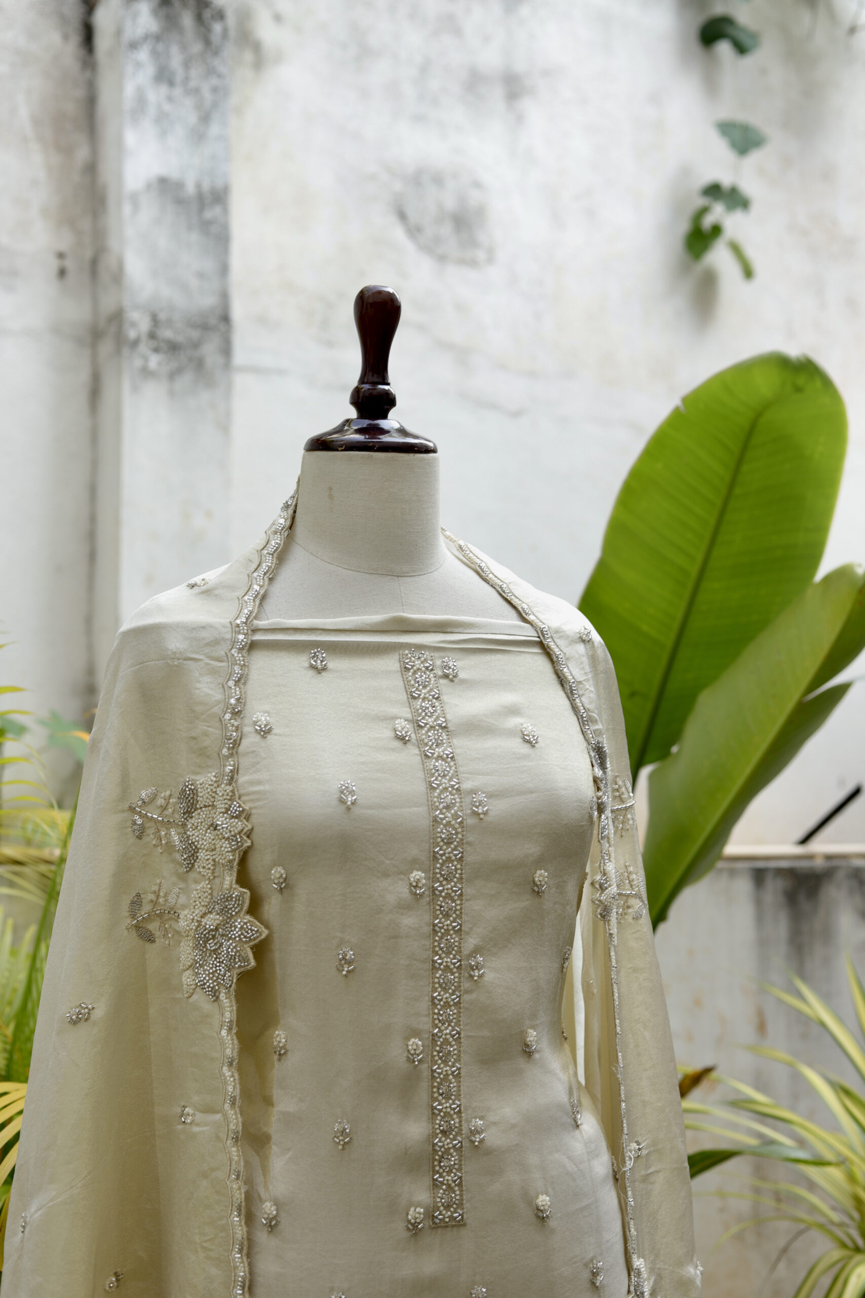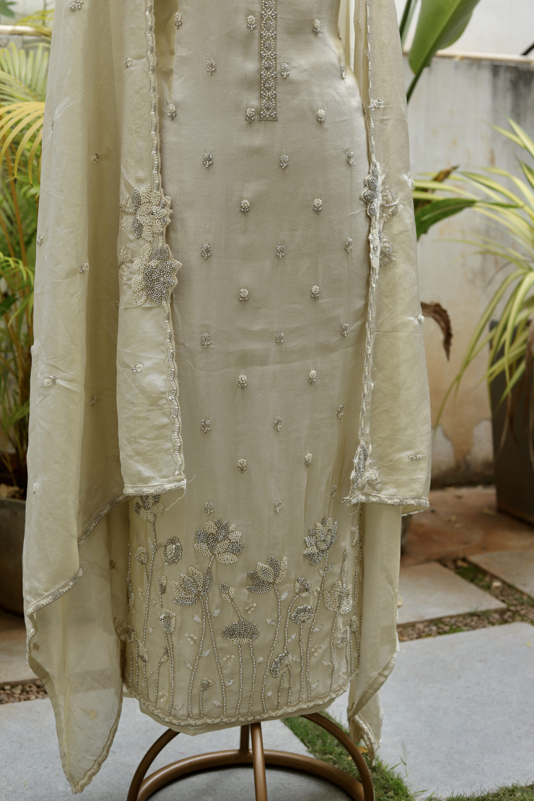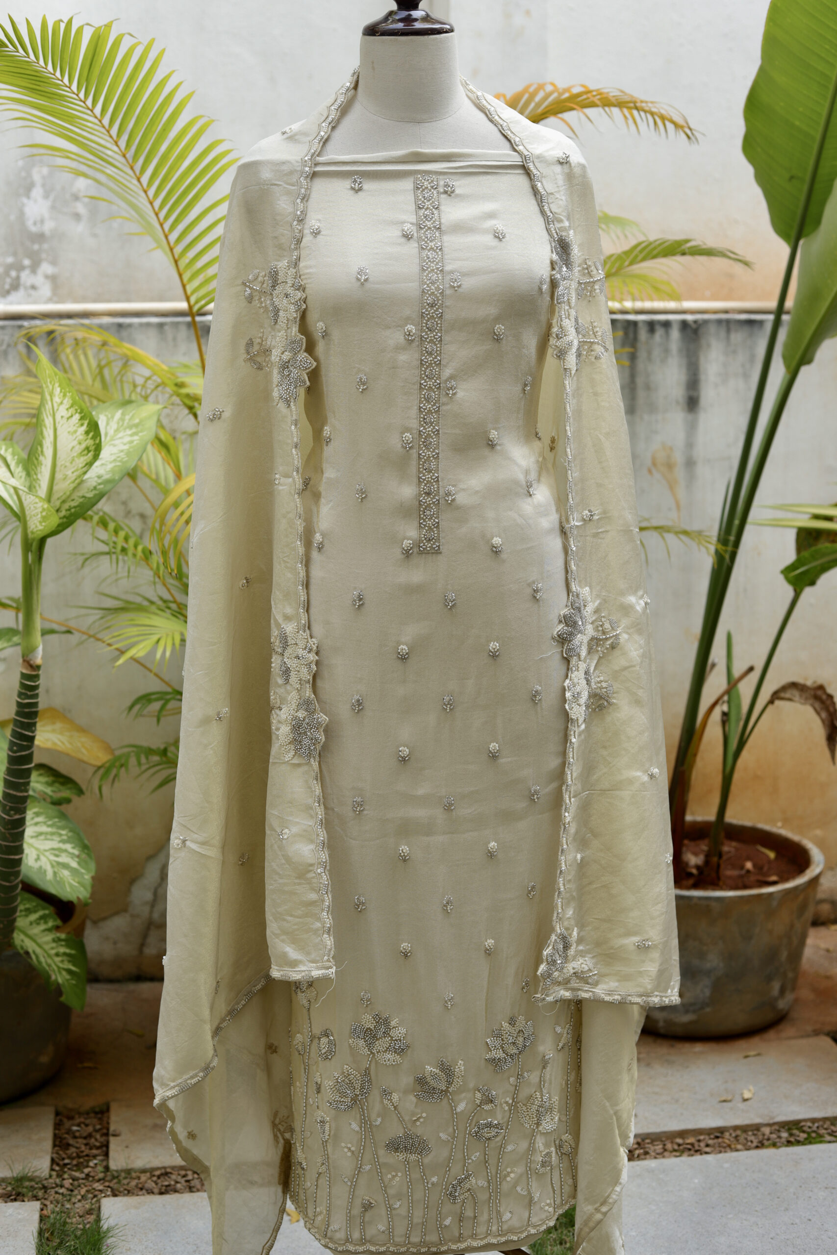 Gracefully crafted in fallen tissue fabric, this elegant unstitched dress material is adorned with delicate allover kardana and moti work, forming subtle floral butis that add a soft shimmer. The dupatta is beautifully highlighted with intricate floral detailing, finished with finely worked scalloped edges and embellished borders, enhancing its ethereal appeal. A perfect blend of sophistication and finesse, ideal for festive gatherings and elegant occasions.