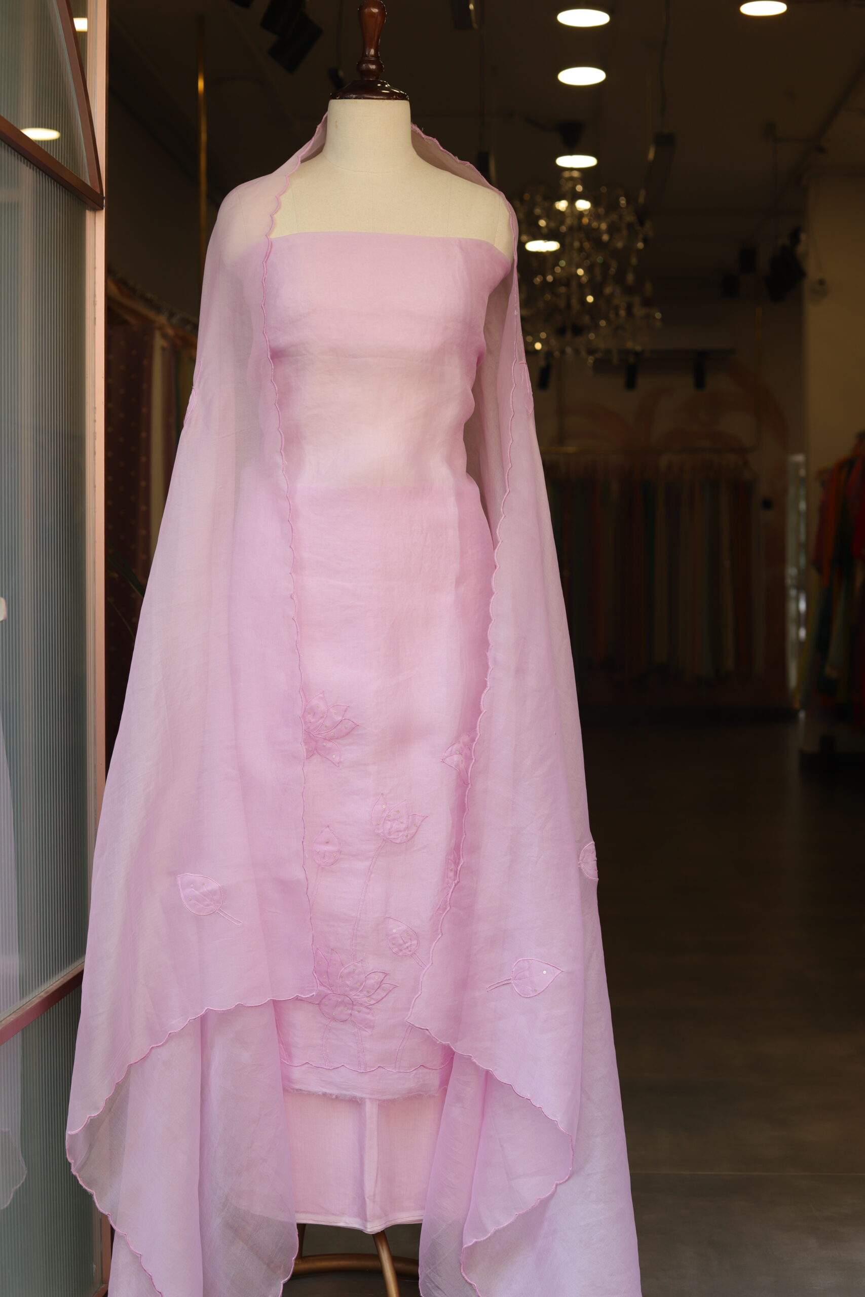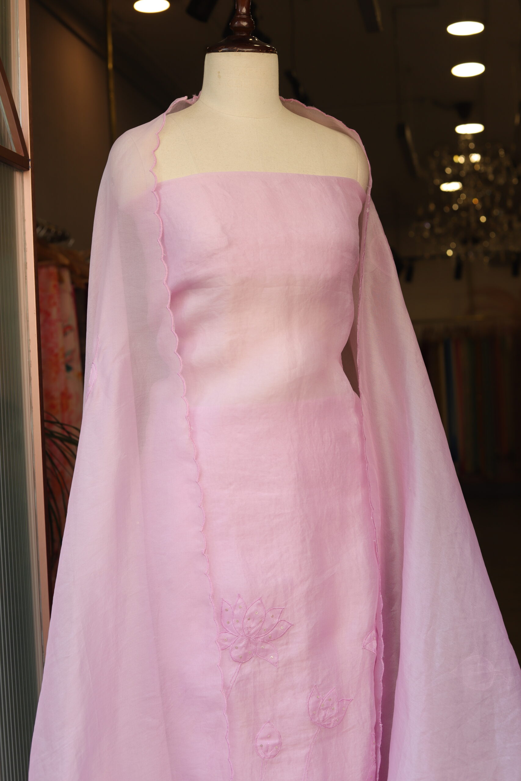 Graceful organza unstitched salwar suit designed in a soft, airy texture that drapes beautifully. Paired with a delicate organza dupatta highlighted with intricate lotus-inspired thread embroidery, the dupatta is finished with elegant scalloped edges that add a feminine charm. A perfect blend of subtle luxury and timeless elegance, ideal for festive gatherings and special occasions.